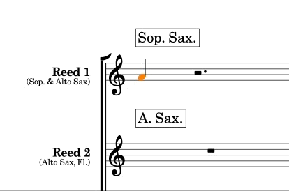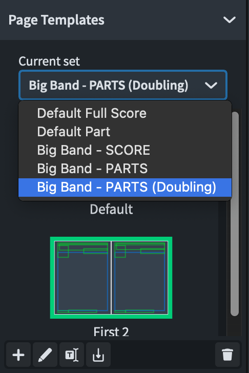 Note that for the parts, there are two separate page templates, with the one called “Big Band - PARTS (Doubling)” including an instrument list at the top left (with the text token “{@stafflabelsshort@}”). This is useful for parts of players who play more than one instrument, including percussionists, “reed” players, trumpets (if they double to Flugelhorn, for example), and Keyboard instruments, to name a few examples.