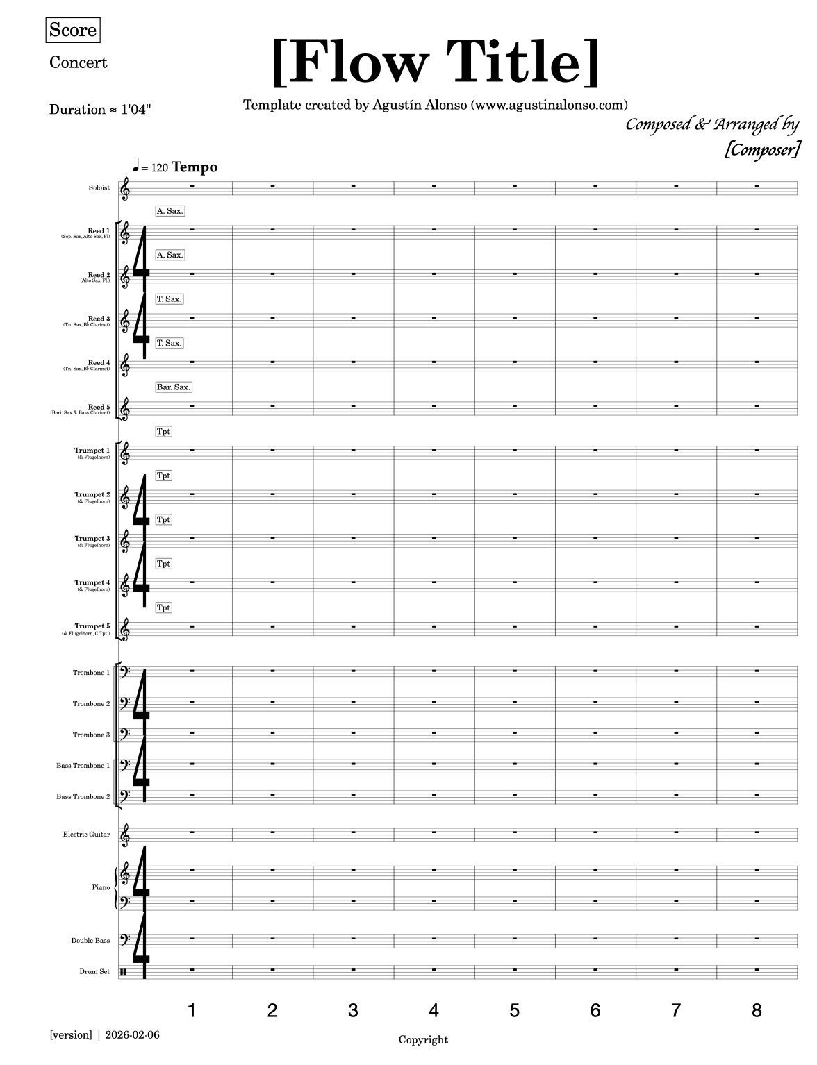 I’ve updated my Big Band Template file, which includes 2 layouts, one for the standard 544 (reeds-trumpets-trombones + rhythm section), and an additional 555 layout. The file includes a revised layout design for both score and parts. You can gain access to this template + the Orchestral template here. (If you’ve signed up for a template on this website before, you should have received it automatically—check your email inbox!).