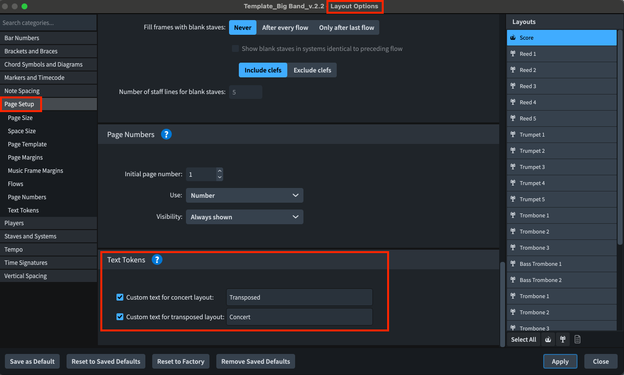 If you have a preferred way to differentiate your transposed and concert scores (for example, some people like to write “in C”), you can do this in Layout Options/Page Setup/Text Tokens (Remember, this will apply to the selected layout on the right side).