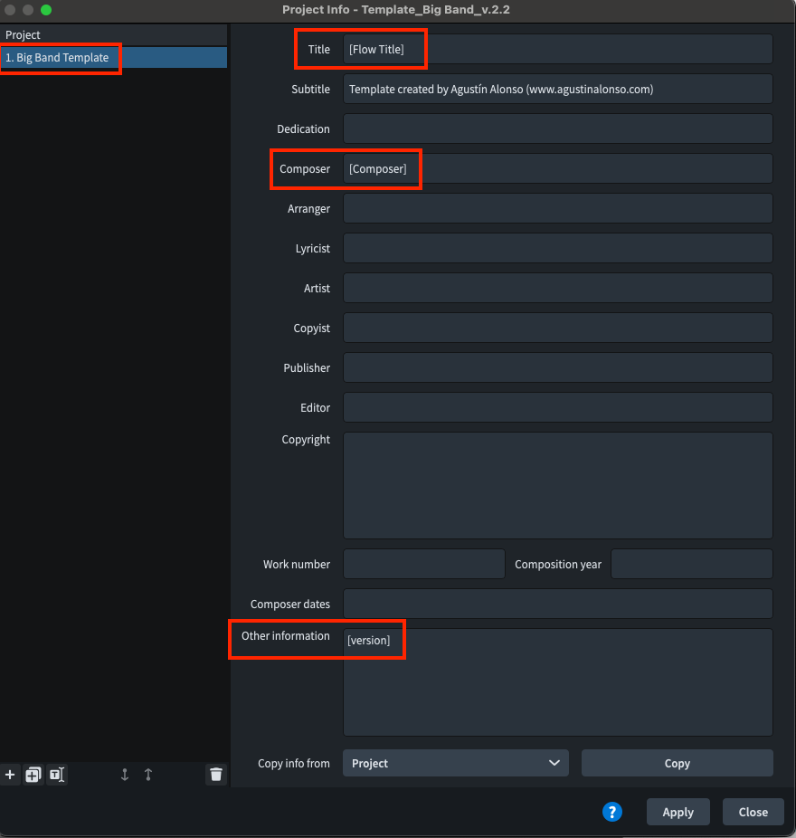 Edit the entries with your project’s information (e.g., Title, Subtitle, Composer
